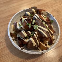 Jewish-Japanese fusion is something you don't find often. Every dish playfully combines characteristic elements from both culinary cultures in a way that actually works. To start, the home fries drizzled with mayo were fun and tasty without straying far from expectation. Next up, the perfectly-round okonomiyaki tasted wonderful and was quite filling, being thicker than usual and stuffed with plenty of sauerkraut. Finally, the sweet and sticky dessert provided a nice ending to the meal and was easy to share between two people. The service was friendly and the large windows let plenty of sunlight into the space. There are many more items on the menu that piqued my curiosity, so I'm excited for what I'll try here next. Overall, the food was great and the combinations are creative and well-executed. Definitely worth a visit.